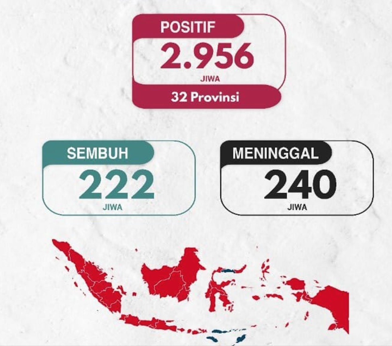 Until Wednesday (8/4) the number of positive Covid-19 patients recovered increased by 18 cases, bringing the total to 222. Covid-positive patients increased by 218, a total of 2,956, and the number of dead patients increased by 19 to a total of 240 cases.