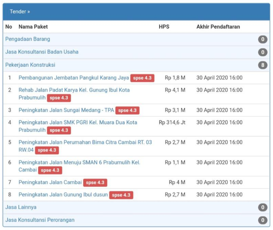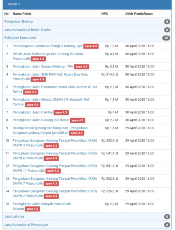 Project packages that ended registration on April 29, 2020, are the Project Capital Expenditures for Building and Building-Procurement of Education Buildings with IDR1.1 billion. Then, the Prabumulih SMPN 3 Junior High School Building (RKB) Project Procurement Project package worth Rp.533.9 million, Prabumulih 6 Junior High School Rp.541.1 million, Prabumulih 11 Junior High School worth Rp541.1 million, Prabumulih 7th Middle School worth Rp 526.8 million, and Prabumulih 2 Junior High School worth Rp.526.8 million. The 15th project package in the LPSE is infrastructure development for the improvement of the South Prabumulih Regional Road by Rp2.2 billion.
