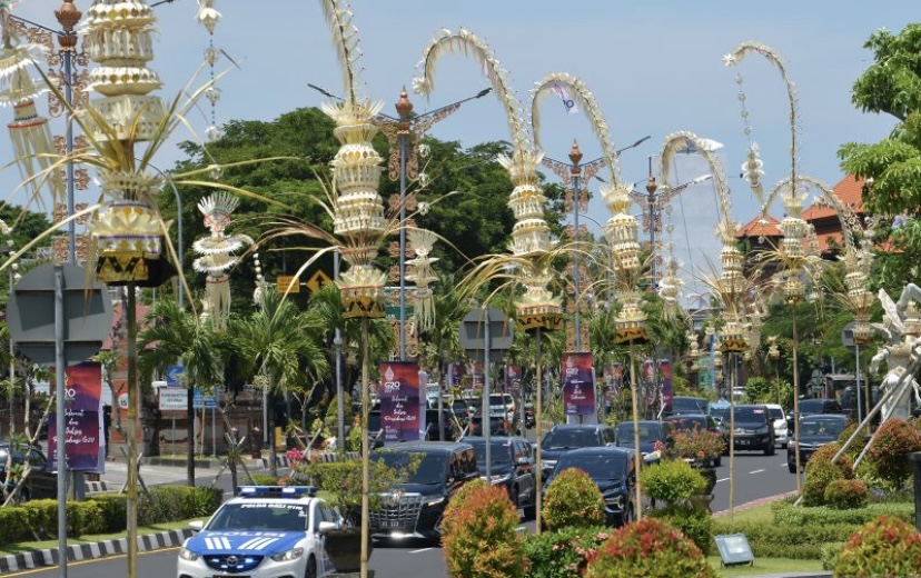 Jakarta, The Indonesia Post – Vehicles pass on a road whose edges are decorated with penjor or Balinese yellow leaf decorations on Jalan Ngurah Rai Airport, Badung Regency, Bali, Thursday (10/11/2022).
