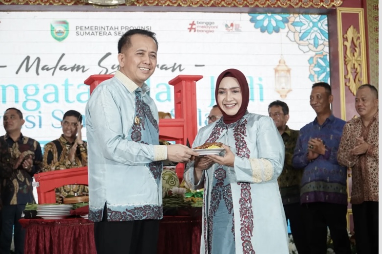 Palembang, The Indonesia Post – Acting (Pj) Governor of South Sumatra Agus Fatoni accompanied by Acting Chair of the Family Welfare (TP-PKK) of South Sumatra Province Tyas Fatoni attended a thanksgiving evening commemorating the 78th anniversary of South Sumatra Province in 2024, the celebration went lively accompanied by songs from the ninth day of Batang songs as songs typical South Sumatran culture. Taking place at Griya Agung, Sunday evening (19/05/2024).