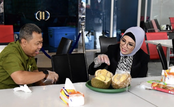 Palembang, The Indonesia Post – The chairman of the South Sumatra Provincial Legislative Council (DPRD), RA Anita Noeringhati, reviews the Palembang Airport Durian Festival at the Airport Plaza in the Sultan Mahmud Badaruddin (SMB) II Airport area of Palembang, Thursday, 08/9/22.