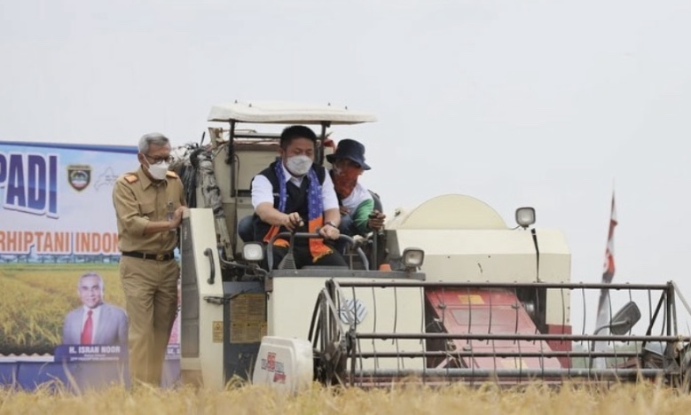 OKU Timur, The Indonesia Post – The Governor of South Sumatra H. Herman Deru accompanied by the Chairman of the DPP Perhiptani as well as the Governor of East Kalimantan Dr. H. Isran Noor and the Regent of East OKU, H. Lanosin Hamzah, ST attended the Corporate Farming Grand Harvest and the Inauguration of Electricity Entering Rice Fields in the Rice Fields of the Sri Rejeki Farmer Group, Peracak Village, Kec. Bunga Mayang, East OKU Regency.