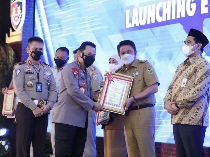 The award was handed over directly by the National Police Chief General Listyo Sigit Prabowo accompanied by the National Police Headquarters Inspector General Pol Firman Santyabudi to Governor H Herman Deru at the Wyndam Hotel Surabaya, Saturday (26/3) afternoon.