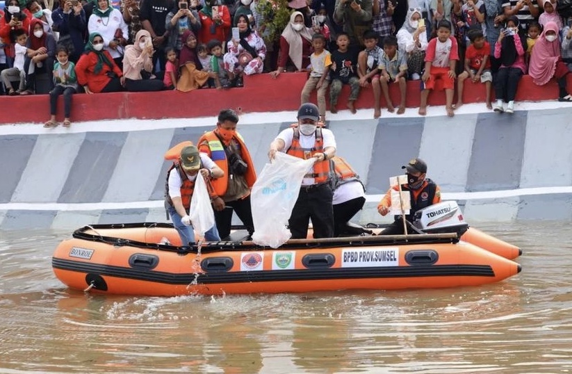 Palembang, The Indonesia Post – After inaugurating the Sekanak Lambidaro Festival, the Governor of South Sumatra H Herman Deru along the Sekanak river using a rubber boat to sow 10 thousand fish seeds.