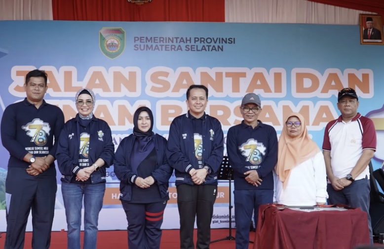 Palembang, The Indonesia Post – Acting The Governor of South Sumatra, Agus Fatoni accompanied by Acting. Chairman of the Provincial PKK Mobilization Team. South Sumatra, Tyas Fatoni took part in a leisurely walk and group gymnastics in commemoration of the Provincial Anniversary. 78th South Sumatra in 2024 with the theme “In the Spirit of the 78th Anniversary of South Sumatra Province Towards an Advanced, Independent and Prosperous South Sumatra” in the South Sumatra Governor’s Office Yard, Sunday (12/5/2024).