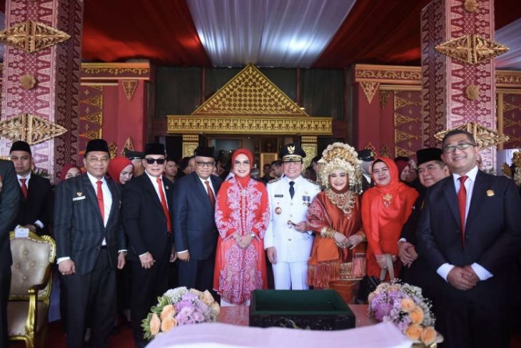 The commemoration of the Proclamation Anniversary began with the hoisting of the red and white flag by the South Sumatra Province flag-raising troops. Continued with the reading of the text of the 1945 Constitution by the Chairperson of the South Sumatra Provincial DPRD, Hj. R.A. Anita Noeringhati.